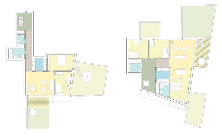 Die Wohnungen zeichnen sich durch ein vielfältiges Angebot an inneren und äusseren Räumen mit differenziertem Öffentlichkeitsgrad aus. Jede Wohnung grenzt mit einem grosszügigen Vorzimmer an das System der öffentlichen Wege und Plätze. Das gemeinschaftliche Zentrum der Wohnungen sind die überhohen Atriumküchen mit ihren Oblichtern. Sie grenzen an die Wohn-zimmer, welche sich über Schiebetüren und eine breite Veranda auf den Garten öffnen. Die privaten Zimmer schliesslich grenzen mit raumhohen Fenstertüren an intime, kleine Patios. Dieses erd-geschossige Raumangebot wird ergänzt durch eine einfache Dachlaube mit Wasser- und Elektroanschluss, welche als Lagerraum, Waschküche oder Bastelraum dient. Vom Haupteingang oder vom Garten her erschliessen im Vordach eingelassene, ausklappbare Estrichtreppen die Dachlauben und je eine kleine Dachterrasse. Das Raumsystem der Plätze, Gärten, Patios, Veranden und Terrassen eröffnet vielfältige Aneignungspotenziale. Das Wohnen beschränkt sich nicht auf das Innere der Häuser – die öffentlichen Plätze werden mit Blumentöpfen oder Pingpongtischen möbliert, in den Gärtenwachsen Blumen und Kräuter, auf dem Dach hängt Wäsche zum Trocknen und im Patio wird vielleicht die neue Modelleisenbahnanlage aufgebaut. Trotz der kompakten inneren Nutzflächen bieten die Wohnungen ein vielfältiges Angebot an Raumproportionen, Lichtsituationen und Ausblicken. Der dicke Dachaufbau mit leichtgewichtigem Substrat garantiert im Sommer und im Winter ein angenehmes Raumklima. Dank der eingeschossigen Bauweise sind sämtliche Zimmer aller Wohnungen vollständig schwellenlos erreichbar.
