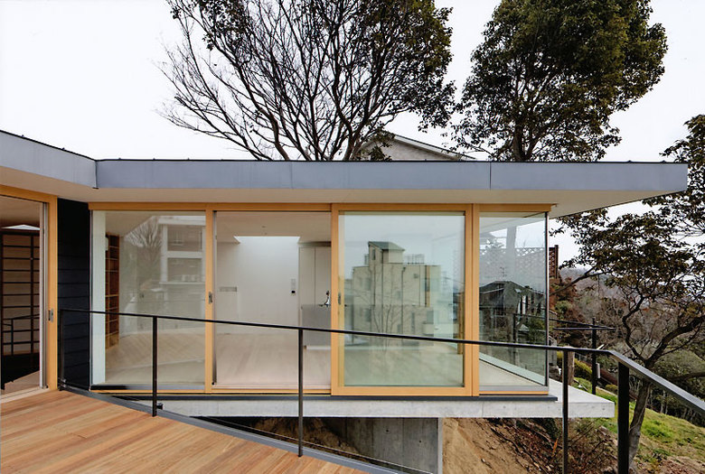 高低差12mもある斜面地に建てられた住宅。硬い岩盤質の敷地のコンタラインに沿って3つのボリュームを斜面に引っ掛けるように置き、それらを三角形の階段空間で繋いでいる。敷地に覆い被さるようにあった既存の桜の大木を下から見上げるようにトップライトを設けている。