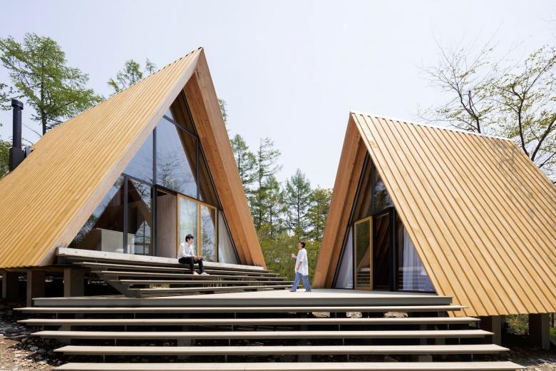 八ヶ岳山麓の標高1,500mという高地に建つ山の家である。夏はきわめて快適で汗をかくこともないが、冬は零下20度になり、雪も深い。さらにこの敷地は南に向かって傾斜していて、最大で5.5mの高低差がある。この場所のそうした条件にできるだけ直截に呼応する建築をつくろうと思った。雪を落とす60度の勾配をもったサンカクの屋根は、ベイマツの2x12インチの板を折板のように継いで、それが構造となり、内部空間の仕上げとなる。その木造の屋根と敷地の起伏と持ち上げられた床だけが基本的なこの建物の構成要素である。敷地の高低差に素直に馴染ませるために、基本のサンカクを大小2個の建物に分けて、眺望を配慮して配置し、間を高低差のあるテラスで繋いだ。