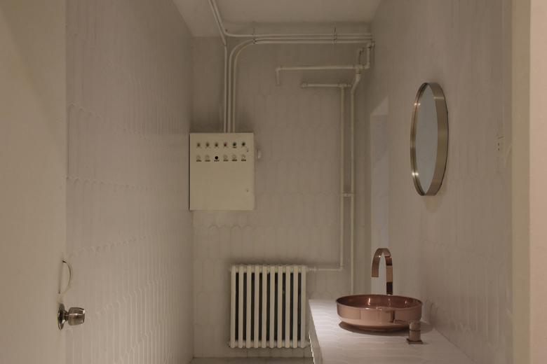 The underground passage environment may look a bit closed. But we hope to give abundant meaning for it without too much added cost. We used bolt fixed to the four walls outline the abstract profiles of different butterflies, and connected them with white industrial polyester line to form a gradient between different shapes. It is the extension of the management space on the ground, if upper space is a beautiful cocoon, so here is the butterfly out of the cocoon presenting exquisite corridor dotted with acrylic hemispheres displaying beauty products, so as to decorate the hollowness and monotonous linear space and increase the commodity display space. In the bathroom, we used white tiles similar to felt scales decorate the overall walls of the front room, sink and bathroom. In the bright and tranquil enclosing space, the round mirror on the wall provides customers with opportunities for self-reflection in their moments of solitude, which could lead to calm and firm judgements.