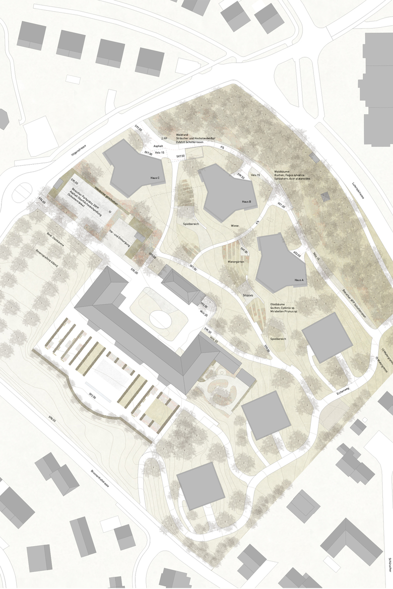 Neben dem Erhalt und stärken von ortstypischen Elemente wie Topographie, Waldrand, historische Gartenelemente und Obstgarten ist für uns der Freiraum als Begegnungsort wichtig. Entlang des Waldes und dem abgestuften Waldrand zieht ein Zugangsweg zu den Punkthäusern. Damit bekommen die Wohnhäuer im Norden eine unabhängige Adressierung. Ein Sitzplatz mit Aussicht lädt zum Verweilen ein. Um die Qualität auf der Fussgängerebene zu stärken, wird der motorisierte Verkehr an den Anfangspunkten abgefangen. In die Topographie eingebettet liegen kleine Plätze, Spielflächen und Mietergärten. Sie sind Trefforte zwischen den Generationen. Alle können am Aussenraum und an seiner Belebung teilhaben, ob in aktiver Betätigung oder auf einer Bank ausruhend. Die Fusswege ziehen sich weiter bis zum Ankunftshof des Pflegzentrums Tilia.