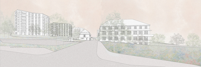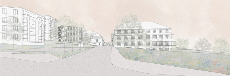 Die heutige Anlage ist geprägt vom Haupthaus und dem grosszügigen Freiraum, insbesondere der «Hoschtet» als Zeuge der früheren landwirtschaftlichen Nutzung. Eine ortsbaulich verträgliche Verdichtung ist nur möglich, wenn die Hierarchie der Gebäude und die Grosszügigkeit des Aussenraums erhalten bleiben. Die Verdichtung beschränkt sich auf den nördlichen Bereich der Parzelle. Mit dem Erhalt der «Hoschtet» bleibt der für das Haupthaus erforderliche Raum und seine Funktion als Zentrum der Gesamtanlage bestehen. Die Neubauten verstehen sich als Weiterführung der würfelförmigen Bauten im Osten der Parzelle und grenzen sich dadurch klar von den historischen Gebäuden des Pflegezentrums ab, welches dadurch weiterhin als eigenständiger Teil des Ensembles verstanden wird.