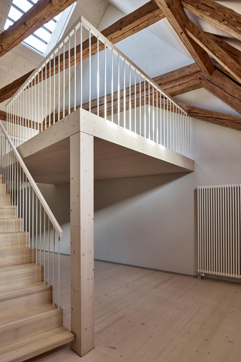 Die wesentlichen Arbeiten am Hauensteinweg 16 beinhalten den Ersatz der haustechnischen Installationen sowie die Vergrösserung des Balkons. Mit dem neuen Lift werden alle Wohnungen hindernisfrei zugänglich gemacht. Die bestehenden Mansardenzimmer werden zu einer attraktiven Wohnung ausgebaut. Die Wohnungen am Rickenweg 17 und 17a im ersten Obergeschoss erhalten einen neuen Aussenraum, welcher über die Küche erschlossen ist. Der imposante Dachraum des Weissensteingutes wird mit vier neuen, zweigeschossigen Wohnungen ausgebaut. Das Thema der vorgefundenen Lichtschächte wurde aufgenommen. So empfängt ein neuer, zenital belichteter Innenhof den Bewohner, bevor er in die Wohnung tritt. Die Wohnungen sind in Anlehnung an den historischen Zustand in Holz verkleidet, was eine eigenständige Atmosphäre generiert.