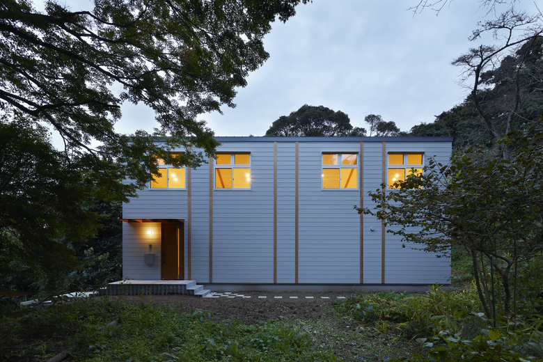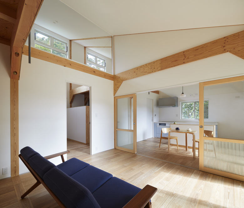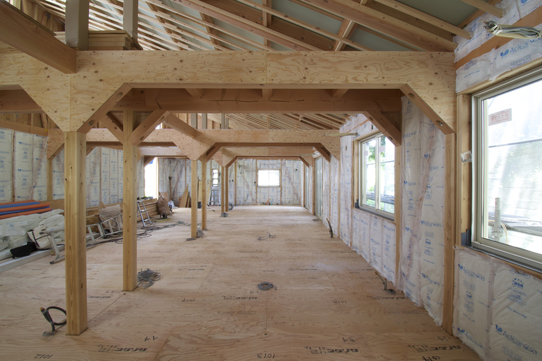 終の住処、とはよく聞く言葉だが、今回はそうではなく、子育てを終えた夫婦2人から子供の世代に引き継いでゆける住処がつくれないかと考えた。それは、生家の維持継続の問題に直面したという背景があるからだ。建物外形はシンプルな長方形にして、耐力壁をすべて外周に収め、将来の間取り変更での制約を減らした。室内は真壁作りとして構造体を見せ、直接手をつけられるようにしてある。法的には1階建てだが、吹き抜けの梁の上に剛性のある床を張れば、2階建てとして再度の確認申請が成り立つように耐力を逆算してある。それらの結果として、柱と梁の接合部に方杖を合板で挟んだハンチ型の構造体が生まれ、内観の特徴になった。