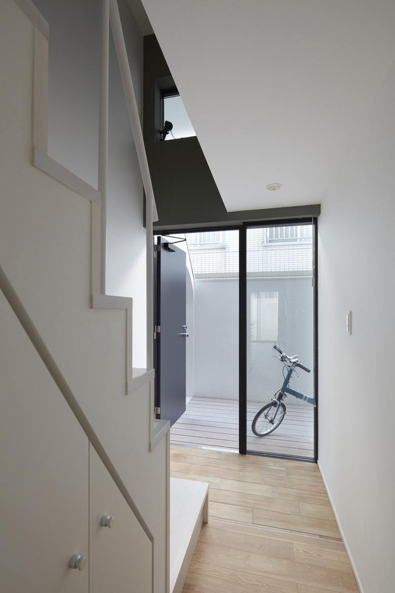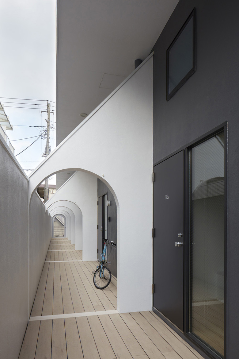 トレイは1階で敷地いっぱいの大きさ、2階で建築面積および斜線制限いっぱいの大きさとしている。ポーチは自転車も置ける広めの住戸前スペースであり、トレイ内の生活に幅を持たせられるように設定している。その壁にアーチ型の開口を設けることで隣のポーチへ行けるようにして、その連続で廊下の代わりとなる動線をつくっているが、隣のポーチを通らないと建物の外に出られない。そういった専有・共有の曖昧さが、今回のような小規模(各階6戸)であれば、無理のない近所付き合いのきっかけになるのではないかと考えた。ポーチは住戸内からガラス建具で見通せるようになっていて、ブラインドでプライバシーの加減を調整できるようにしてある。