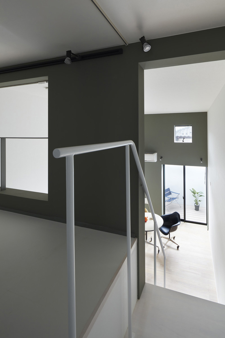 トレイは白く仕上げ、そこに仕切り板のようなグレーの壁を挿入することで、住戸・バルコニー・ポーチをエリア分けしている。住戸はすべてロフト付きにして3.8mまで天井を上げ、最高高さは10m近くになっている。高い壁で囲まれた内側が閉鎖的になりすぎないように、トレイのバルコニーとポーチにあたる部分を斜めにカットし、そこから光や風を取り入れつつ、外観の特徴を作っている。