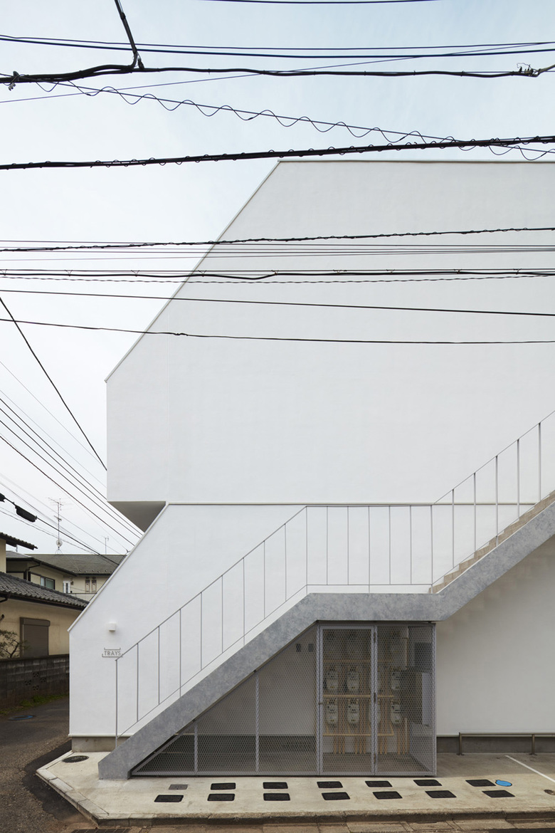 住戸・バルコニー・ポーチを内包するスタッキングトレイのような居住スペースを設定し、それを縦横に並べて共同住宅を構成している。
