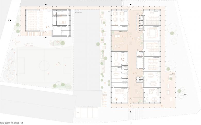 Durch den zunehmenden Ganztagsunterricht wird die Schule immer mehr zu wichtigem Lebensraum der Kinder und LehrerInnen, in dem sie einen Großteil ihrer Lebenszeit verbringen. Diesen Ort so zu gestalten, dass er den Kindern zahlreiche Möglichkeiten der Nutzung, Aneignung, Identifikation und sozialen Interaktion bietet, ist das wichtigste Ziel des Entwurfes. Gleichzeitig erfordert eine zeitgemäße Pädagogik Räume, die unterschiedliche Lernsituationen und Lehrkonzepte zulassen. Die Vielfalt der Unterrichtsformen spielt vor allem bei einer Ganztagsschule eine wichtige Rolle, in der die Kinder auch außerhalb des Unterrichts lernen und spielen können. Jede Schule bietet überdachte und offene Bereiche als grünes Klassenzimmer, die für den Unterricht im Freien nutzbar sind.