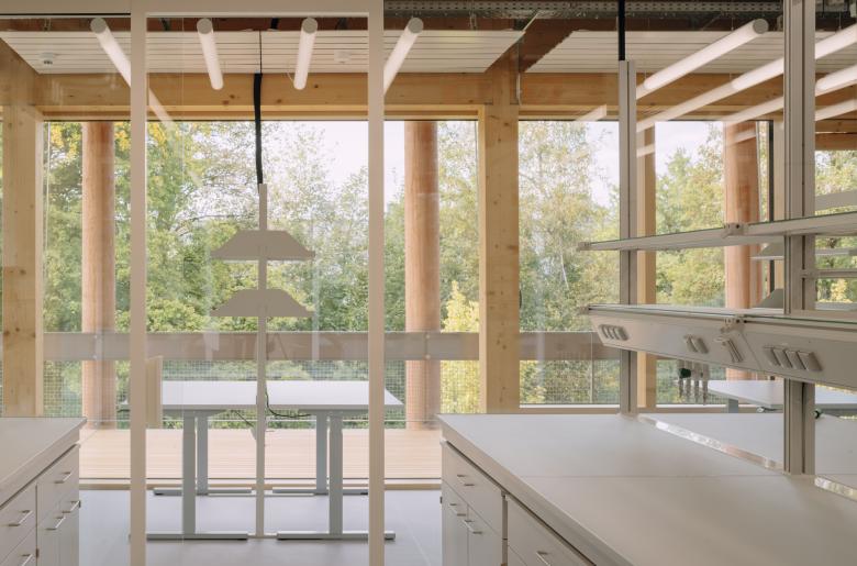 Ein Holzbau verheiratet sich mit dem 1.15m-Laborraster. Der zweigeschossige Pavillon gliedert sich in vier unterschiedliche Raumschichten: Erschliessung, Labore, Büros und Zentralraum. Unser Beleuchtungskonzept nimmt den Gebäuderaster auf und reagiert mit unterschiedlichen Lichtlösungen auf die jeweiligen Raumsituationen und deren Funktionen.