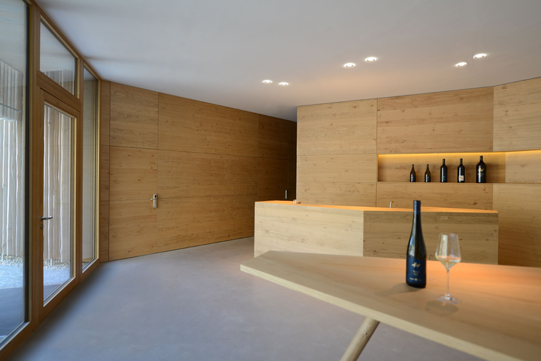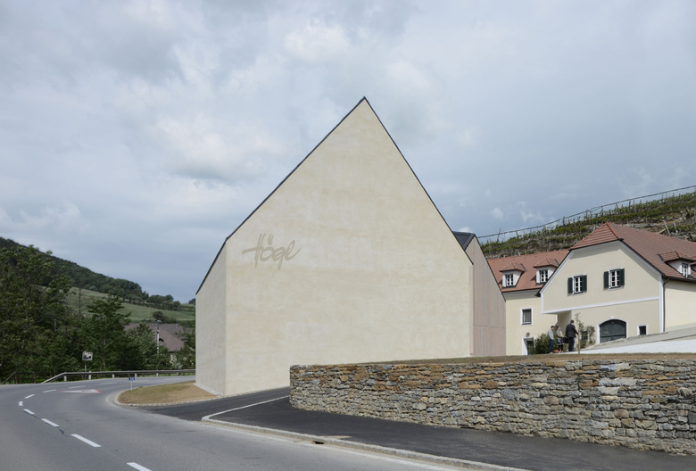 Das Gebäude verstärkt die Kraft seines Ortes und geht auf das Potential des Ensembles ein, in dem es den Hof vervollständigt. Das Haus bildet mit den bestehenden Gebäuden einen von der Landstraße abgeschirmten Innenhof der zum gemütlichen Verweilen einlädt. Der Neubau nimmt in seiner Volumetrie die zwei Funktionen Produktion und Verkostung auf. Die Produktionshalle entwickelt sich entlang der Straße, während der Verkostungsteil sich mit seiner Schauseite einem Vorplatz zuwendet. Der Neubau definiert zwei voneinander getrennte Anfahrtszonen. Die Giebelseite empfängt die Besucher und weist zu einem repräsentativer Ankunftshof, an den sich der intime Innenhof angliedert. Das Haus will sich bewusst in die historisch gewachsene Materialsprache der Wachau eingliedern. Es zeigt dick verputzte Wände die dem regionalen Handwerk entsprechen. Die Glasflächen sind mit eng gesetzten weiß gekalkten Holzlamellen abgeschirmt, die die Unebenheit ihres Wuchses zeigen. Das Dach ist mit einer klassischen „Eternitdeckung“ eingedeckt. Diese Art der Deckung hat eine lange Tradition in der Region, die bis in die Monarchie zurückreicht.