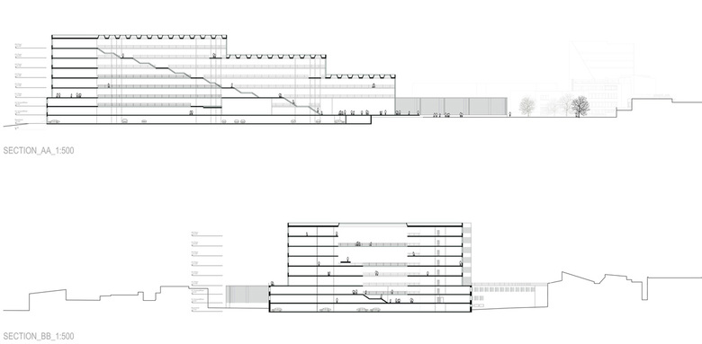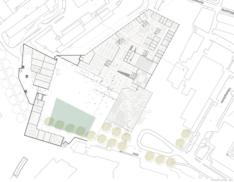 Die Situierung des Gebäudes inmitten des freien Raums betont das für den Campus charakteristische Prinzip der die verschiedenen Cluster durchfliessenden Landschaftsräume.Der von den Architekten vorge- schlagene zentrale Platz bindet die neuen und alten Bauten zusammen und lässt dank seiner leicht abgesenkten Lage den offenen Land- schaftsraum durch das neue Zentrum des Campus fliessen. Der Platz ist Schnittstelle zwischen Campus und Metrostation. Um ein Geschoss tiefer in die abfallende Topographie integriert, gelangt man direkter von der Metrostatiom ins Freie. Arkaden mit Cafés, Bars oder Geschäften säu- men den Platz und machen ihn, geschützt vor Wind, zum Mittelpunkt des gesamten Campus. Im Winter dienen die Arkaden als wettergeschützte Wegverbindungen zwischen den verschiedenen Campusgebäuden. Der Platz selber kann als Eisbahn genutzt werden.
