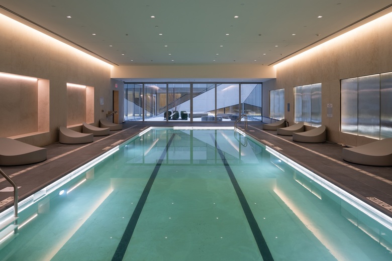 The valley is a calm oasis amidst the busyness of 23rd Street and Lexington and is centered around residential amenities and balconies, establishing an inside-outside living within the complex. The interior façade of the two towers facing the courtyard resonate with the three-dimensionality of the exterior façade—a ribbon of volumetric balconies provide a sculptural view up to the sky. Although similar in form, the valley’s materiality of light, perforated aluminum enhances daylight while giving the courtyard its own unique identity.