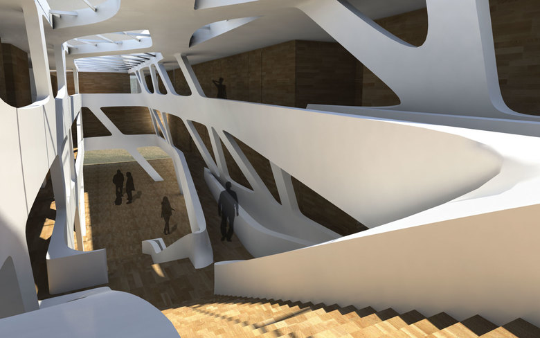 Im Zuge der bei der Faltung entstehenden Verbindungen entwickelt sich ein diese interpretierendes Raumgerippe, das für die statische Konstruktion, die Erschließung und die besondere Identität der Musikuniversität – mit seinen gleichsam musikalischen Schwingungen – sorgt. Ein komplexes Innenleben bei kompakter äußerer Erscheinung lässt auch die Assoziation der Bauweise mancher Musikinstrumente zu.