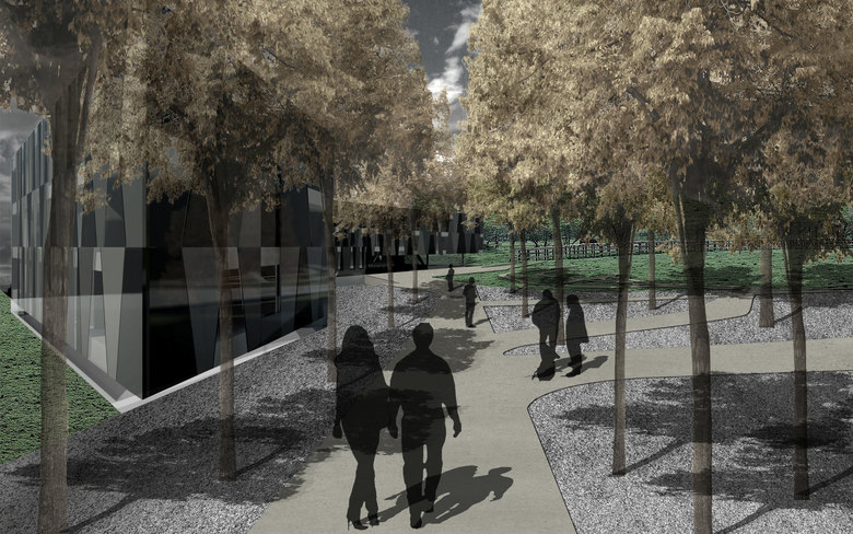 Das Freiraumkonzept nimmt Anleihe in der Epoche der Romantik, die sich auf verschiedene Metaphern aus der Natur bezieht. So wird dort der Wald als kontemplativ und introvertiert, als dunkel und mystisch betrachtet, die Erkenntnis ist das Licht. Das Thema dunkel/hell, dicht/licht spielt im Entwurfsansatz eine wesentliche Rolle. Man wird von den Lichtungen geleitet, die quasi als szenische Topoi zu betrachten sind. Ausformuliert wird dies im Bepflanzungsvorschlag, der eine Zonierung von der Unordnung des Parks zur Ordnung in den gebäudenahen Bereichen vorsieht. Aus Wald wird Hain, aus Hain wird Allee. Die Anordndung der Bepflanzung nimmt verschiedene Richtungen auf. Es entstehen dadurch Finger, die teils ins Gebäude, teils in den Park weisen. Schon direkt beim Betreten des Grundstücks gibt es diese Wahlmöglichkeiten. Zugleich ist bereits beim Betreten des Grundstücks eine Art Introduktion des gesamten Themas, des Waldthemas, angedacht. Hier bezieht man sich auf Parallelen in der Komposition, in der ein kurzer Instrumentalsatz oft einem Hauptsatz vorangeht.