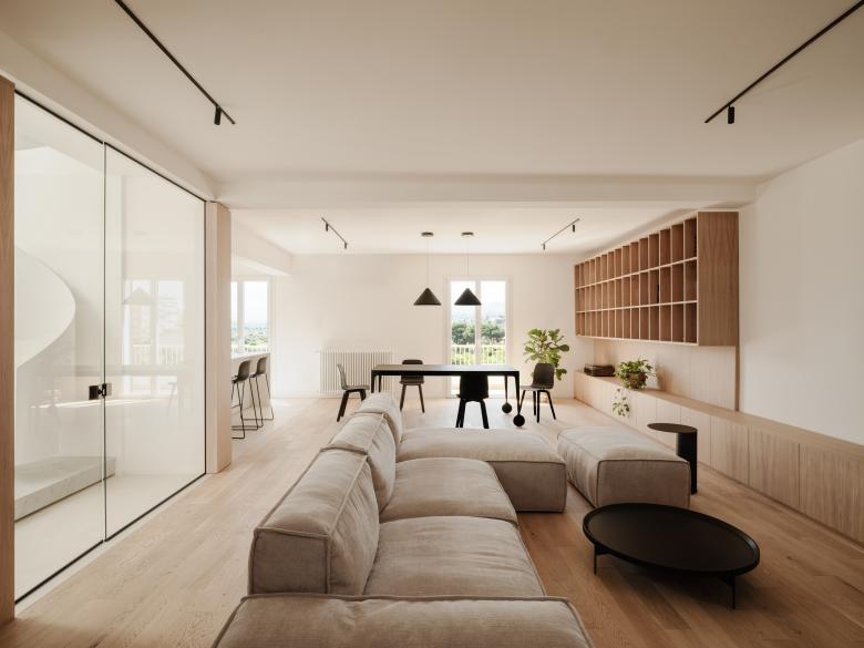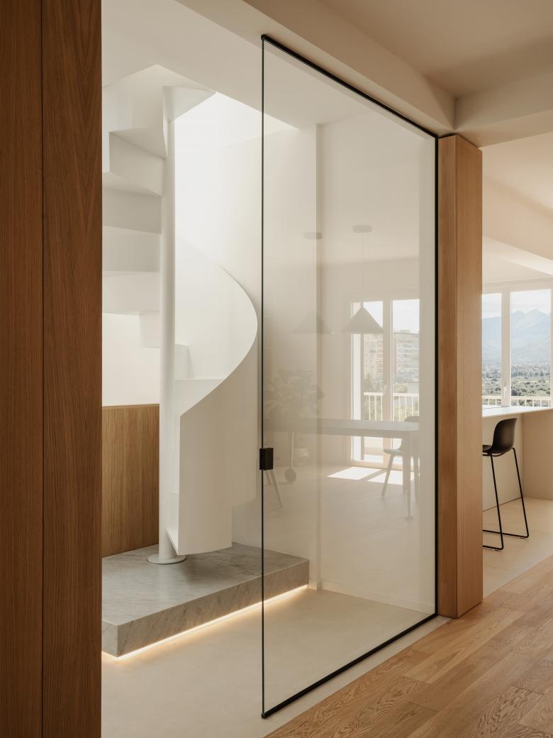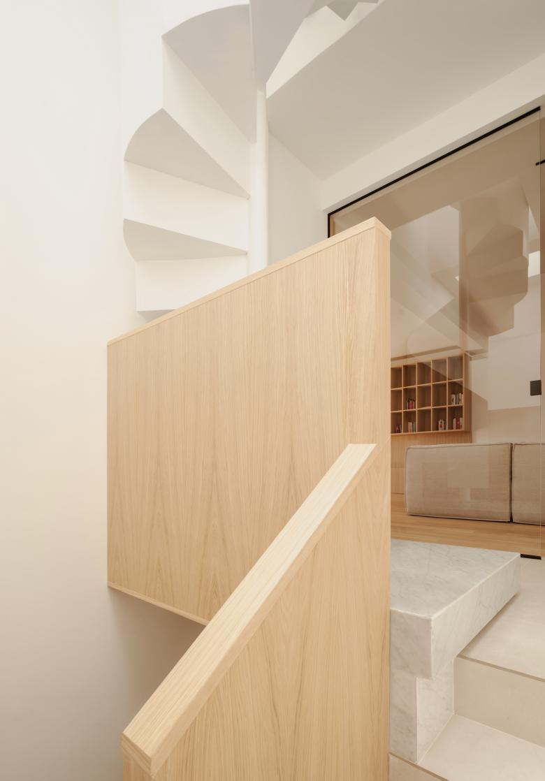 L’elemento a chiocciola ridisegnato come un esile velo di metallo, è il punto culminante del sistema, si inserisce nello spazio del living come un vero oggetto d’arredo, separato da una parete in vetro che lo isola e al tempo stesso lo mette in scena. Una boiserie con ante attrezzate completa il sistema, funzionando come un grande “iper-mobile” che contiene le connessioni verticali e gli spazi di servizio.