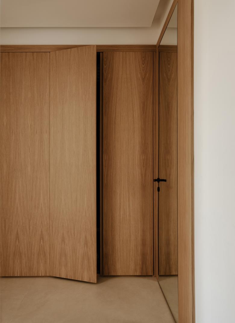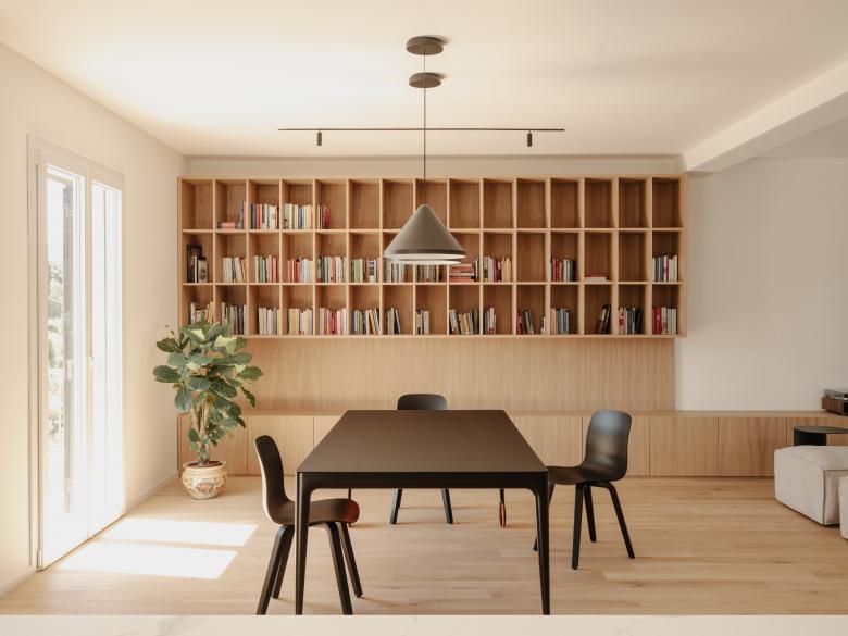 A completamento del living, un arredo su disegno in legno di rovere, composto da un elemento basso contenitivo e da una libreria sospesa, diventa il fulcro visivo e funzionale dell’ambiente, espressione del desiderio del committente di coniugare calore materico e ordine formale.