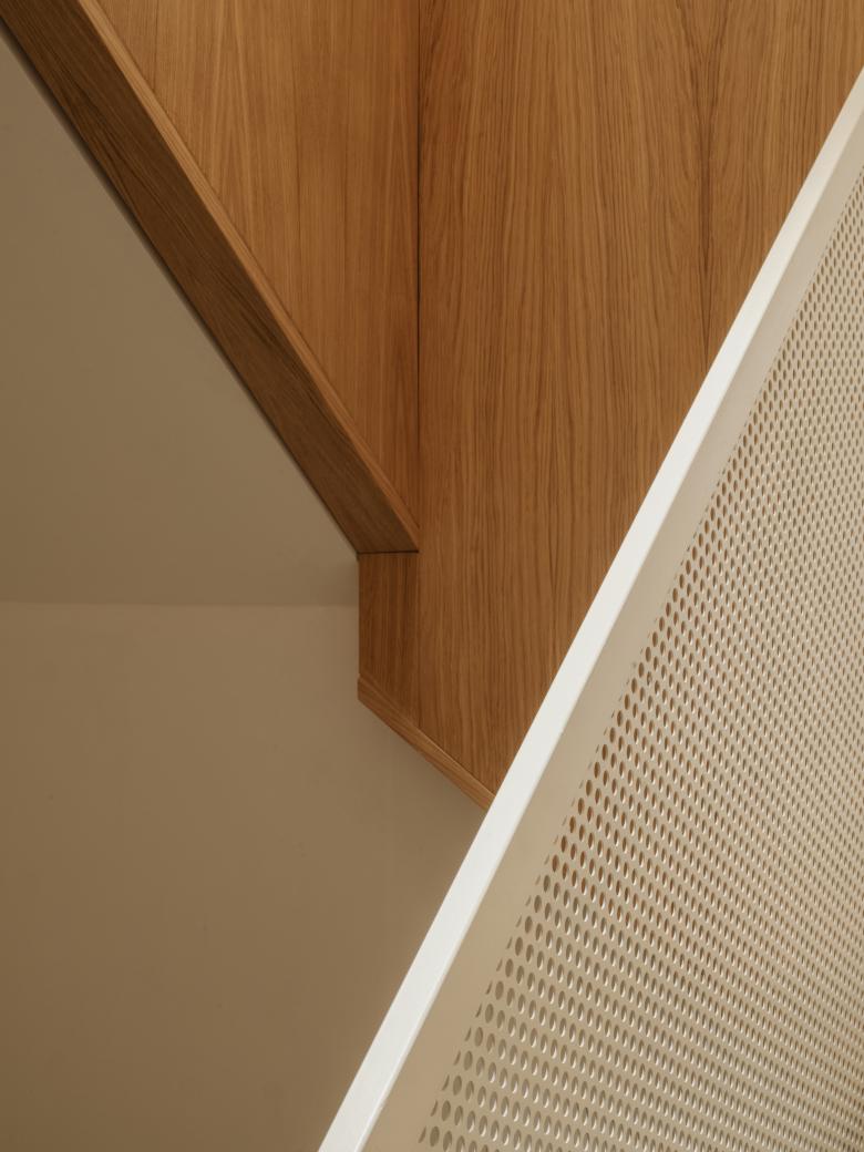 La scala, vera protagonista dello spazio domestico, attraversa verticalmente l’intero edificio come una “promenade” architettonica, illuminata da una luce zenitale che ne esalta la presenza. Nella sua composizione alterna materiali e percezioni: un primo tratto in lamiera forata bianca, leggera e quasi sospesa, lascia progressivamente spazio a un rivestimento in legno di rovere che ne accentua la matericità e il calore.