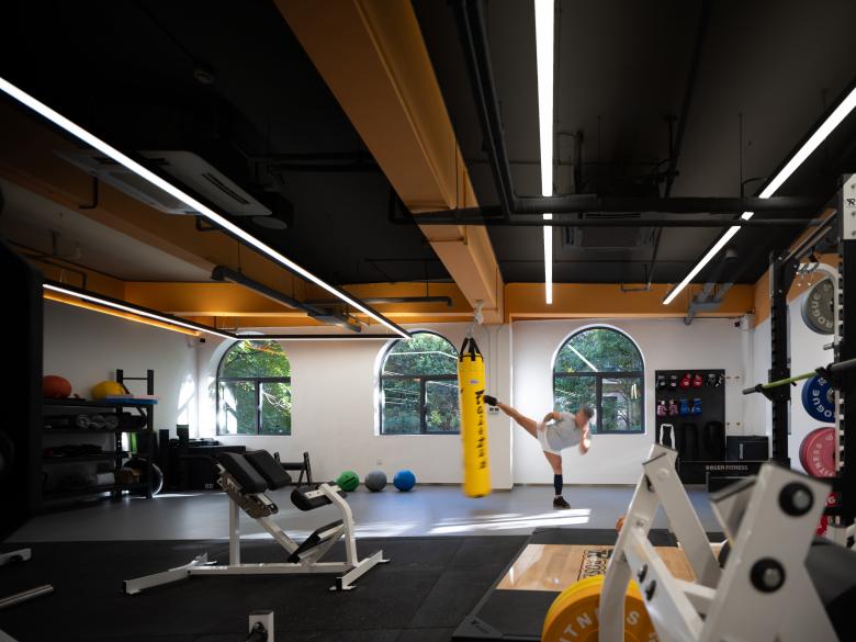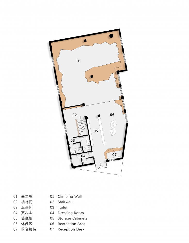 The open coffee space allows seated guests to interact with the climbing area during breaks, fostering communication among activities within the venue. The section near the exterior wall utilizes natural light, enhancing environmental comfort. This space serves as an energy refill after workouts and a hub for climbers to exchange climbing techniques.The fences are woven from climbing ropes, embedding athleticism into the boundaries themselves. Here, neighbors bond through belay, turning climbing into
