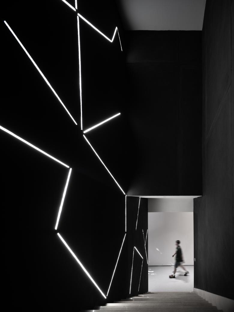 The stairwell walls extend the geometric composition of the climbing zone's angular cuts, using dark, textured materials and light strips to create an immersive natural cave environment.