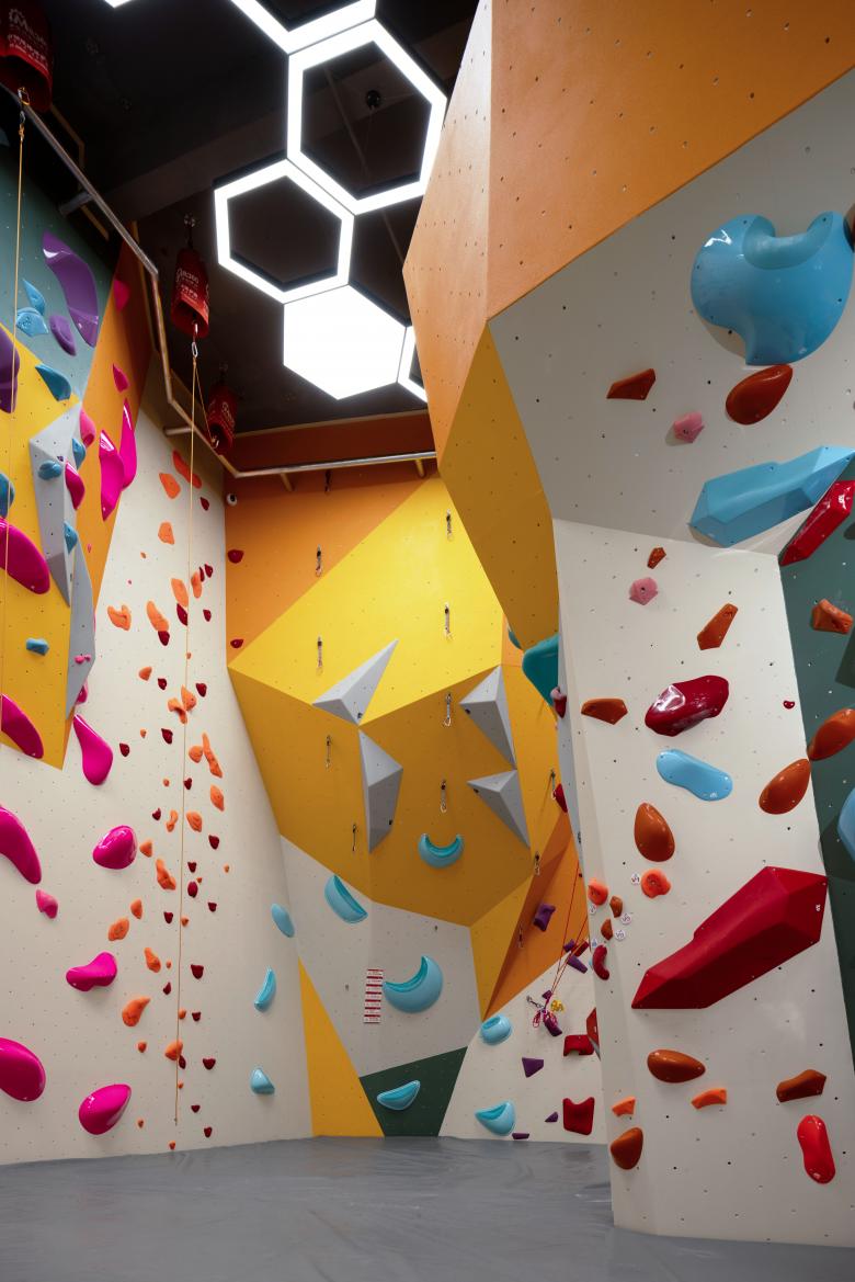 The bouldering walls combine volumes and holds in earthy tones, natural wood, and vibrant orange—natural yet energetic. Custom grips shaped like hearts, numbers, and letters add playful surprises. Overhead, polygonal lighting hovers like invisible routes traced by setters, turning every move into a performance of light and body.