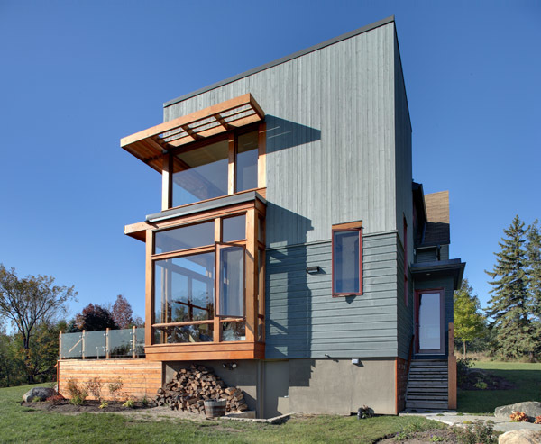 The renovation and extension of this turn-of-the-century farmhouse near Creemore, Ontario, replaces the home’s existing addition with a more contemporary two-storey tower with views of the surrounding countryside. The addition houses a vestibule, powder room, kitchen, and sitting area on the ground floor, and is connected to the second floor by a new stairway – leading to the master suite. From the sitting area on the ground floor and the master bedroom on the second floor, corner windows project towards the southeast with expansive views. A deck extends from the south face, overlooking the pond below. The structure is clad in a combination of horizontal and vertical wood siding, with cedar accenting the corner windows, sunshades, deck, and railings. The contemporary expression of the new tower addition allows for increased ceiling heights and a more generous volume of space over a small footprint, while at the same time preserving the simplicity of the traditional farmhouse form.