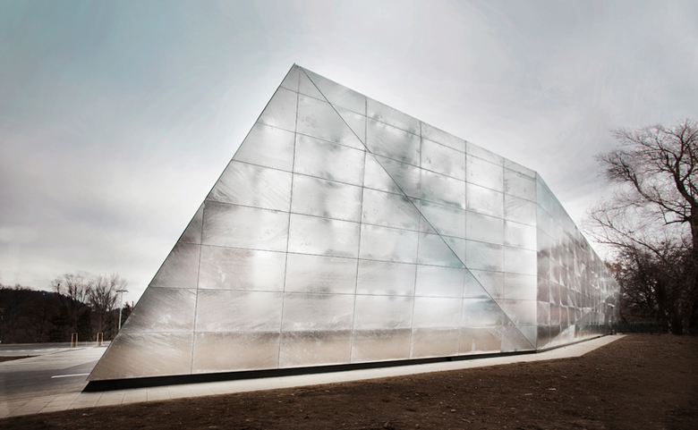 Die Hülle selbst hat leichte Knicke und Faltungen. Dadurch entsteht aus jeder Perspektive eine andere Wirkung und das Gebäude bekommt eine große Dynamik und Spannung: „wie ein Sportler vor dem Sprung“. Bei der Fassade war eine große haptische Qualität der Materialien wichtig, diese sollen die Themen Klimaschutz, Natürlichkeit aber auch Modernität und Innovation transportieren. Als Materialien wurden verzinktes Stahlblech und Holz gewählt. Beide vermitteln in ihrer Gegensätzlichkeit die verschieden Aspekte der Thematik und erzeugen so zusätzlich Spannung. Das Dach ist als fünfte Fassade mit kreis- und hügelförmigen Grünflächen gestaltet.