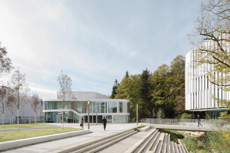 Ihre Glasfassaden wurden mit vorgestellten, perforierten, weißen Vertikallamellen gestaltet, die als Filter zur Umgebung wirken. Die halbdurchlässigen Lamellenfassaden erzeugen eine besondere Lichtstimmung in den Räumen. Die großzügig verglasten Loungebereiche öffnen sich nach außen, beziehen die natürliche Umgebung ein und schaffen eine entschieden andere, neue Arbeitsumgebung. Das Grundstück liegt in landschaftlich reizvoller Umgebung am Ende des Schießtals, nördlich von Schwäbisch Gmünd. Bewaldetete Hügel fassen das von zwei Bachläufen durchzogene Werksgelände ein. Ziel des Projekts war die Schaffung einer hochwertigen und modernen Arbeitsumgebung im Innen- und Außenraum.