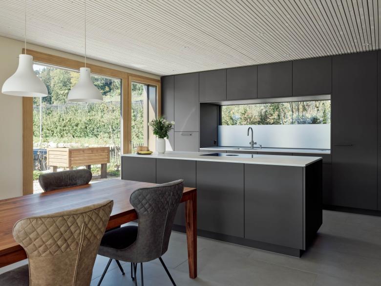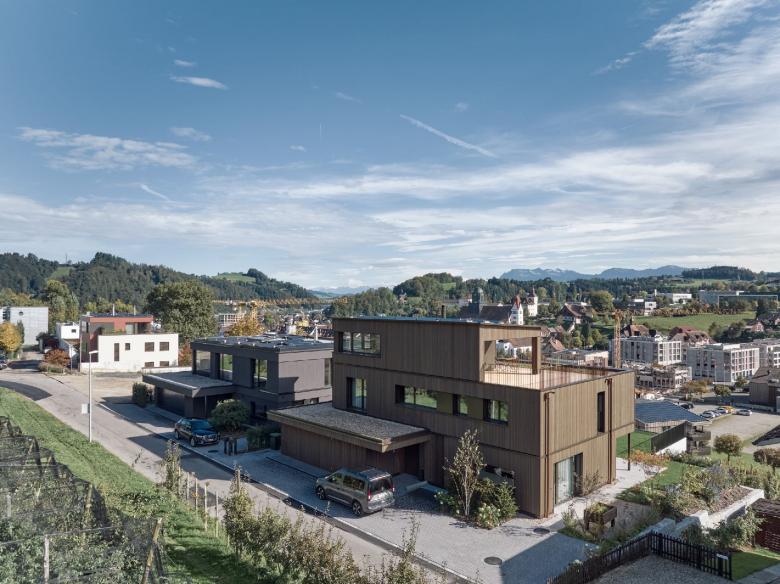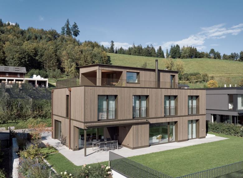 Als Inhaber eines regionalen Holzbauunternehmens ist die Bauherrschaft stark mit dem Werkstoff Holz verbunden. Das gesamte Gebäude wurde in Holzbauweise erstellt. Die natürliche und nachhaltige Materialisierung gibt dabei dem Gebäude seinen eigenen, ausdrucksstarken Charakter mit viel wohnlichem Charme.