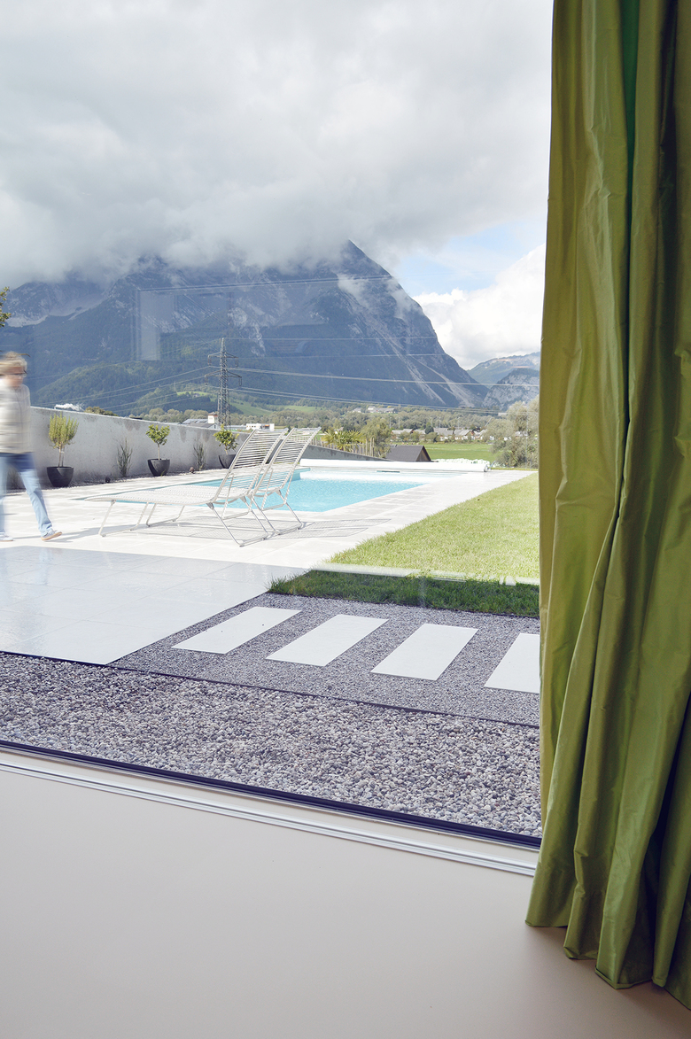 Durch den eingeschossigen Baukörper und der Wahl eines Satteldaches, mit einer geringen Traufenhöhe, bleiben Pool und Garten uneingeschränkt belichtet. Den Abschluss Richtung Osten bildet das Bestandsgebäude. An der westlichen Grundgrenze wurde ein Sichtschutz errichtet, welcher durch seinen Verlauf Schutz bietet, jedoch den Ausblick nach Westen nicht einschränkt und zusätzlich eine Anpassung des Geländes zulässt.