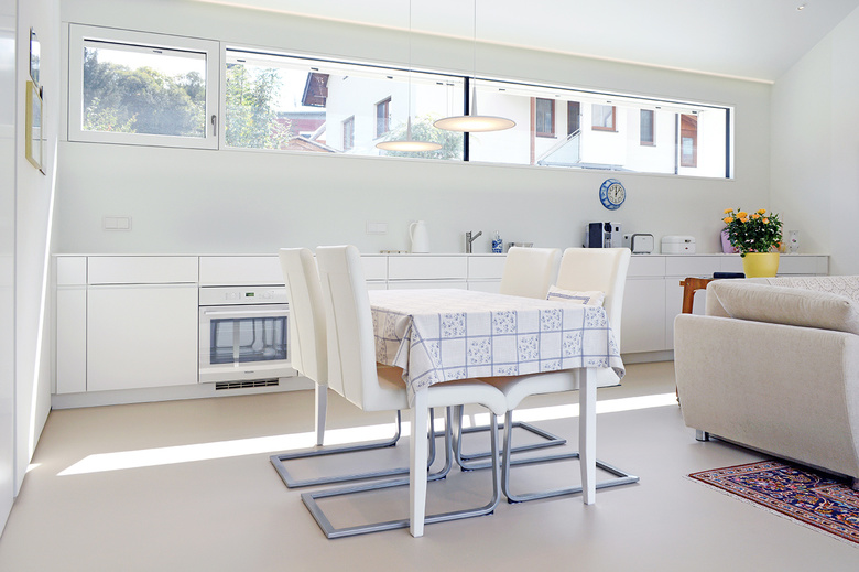 Die Konstruktion wurde als Holzriegel ausgeführt, welcher zugleich eine kurze Bauzeit sowie hohe Genauigkeit ermöglichte und weitere Vorteile bei der Abwicklung der Details brachte. Die großformatigen Eternit-Fassadentafeln brachten die gewünschte Haptik, um den hellen Baukörper angenehm warm erscheinen zu lassen. Zugleich ermöglichte die Fassadentafel ein einheitliches Material an der gesamten Gebäudehülle. Der Gedanke der Zurückhaltung wird in den Innenräumen bestärkt. Sämtliche Einbaumöbel, Wände und Boden nehmen sich mit der hellen Oberfläche zurück. Ausgewählte, zum Teil antike Möbelstücke und Einrichtungsgegenstände, treten in den Vordergrund. Dieser Kontrast spiegelt den Charakter der Bauherrn und bietet einen harmonischen Wohnraum.