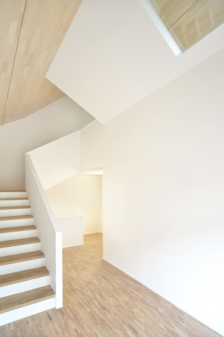 Der hangseitige Wohnteil wurde komplett rückgebaut und durch einen dreigeschossigen Klimaholz-Elementbau ersetzt. Die Geometrie schliesst dem bestehenden, talseitigen Wohnhaus an. Das Massivholzbausystem garantiert eine speditive Aufrichte, erlaubt beachtliche Spannweiten, und erzeugt ein nachhaltiges und angenehmes Raumklima. Dem zweigeschossigen Wohnraum liegt ein offener Treppenkörper mit Galerie an. Er dient als vertikale Verbindung zu den zwei oberen Zimmergeschossen, schafft wechselnde Sicht- und Raumbezüge und macht das ganze Wohnhaus erlebbar. Im Wohnbereich sind Decken in naturbelassener astreiner Weisstanne, Wände mit glattem weissen Vlies und Böden in weiss geöltem Eichenparkett gehalten. In den Nasszellen schaffen ein abgeplätteter Lehmputz und Feinsteinzeugplatten eine angenehme Atmosphäre. Bei der handwerklich anforderungsreichen zweifarbigen Putzfassade mit prägnantem Fries- und Sockelband wurden zwei unterschiedliche Putzstrukturen in Weisskalk-Weisszement umgesetzt. Eine integrierte Photovoltaikanlage im Ziegeldach und Erdsonden mit Wärmepumpe erlauben einen energieautarken Betrieb.