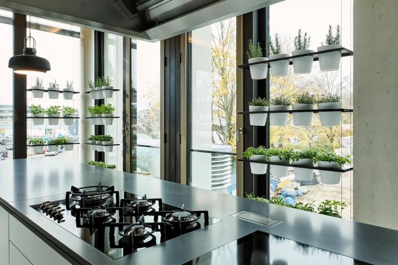 Auch die vorgesetzte Fassade im Bereich des Mitarbeiterkasinos im Erdgeschoss sucht die Nähe zum Neubau: Gleich einer Klammer verbindet sie sich in ihrer Materialität mit dem schwarzen Eloxal der Fenster des gegenüberliegenden Gebäudes. Eine fast wohnliche Atmosphäre wird im Innern durch Kräutergärten an den Fensterfronten erzeugt, die darüber hinaus als Sichtschutz fungieren. Sitzbänke in einem kräftigen Aubergine-Ton harmonieren mit den Eichenholzmöbeln und den schwarzen Pendelleuchten. Durch das Feingefühl der Planer präsentieren sich Neu- und Altbau nun als Einladung für die Kunden und als Versprechen einer hohen Aufenthaltsqualität für die Mitarbeiter.