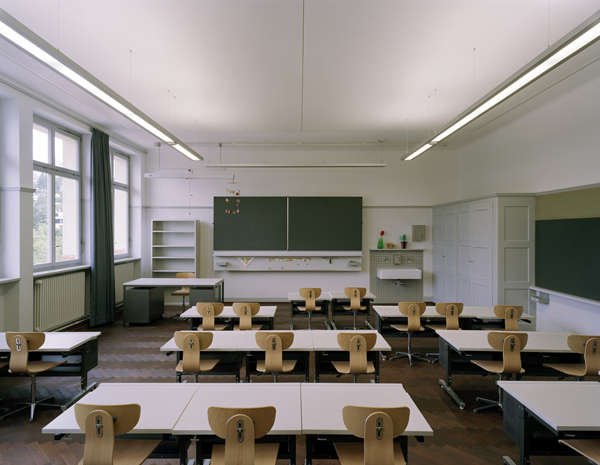 Aus denkmalpflegerischen Überlegungen erfahren die Korridor- und Foyerzonen eine Rückführung in ihren ursprünglichen Zustand. Hier wurde der ursprüngliche Tupfenanstrich wieder appliziert, die Türleibungen und die Holzmaserierung an den Türen nachgebildet.