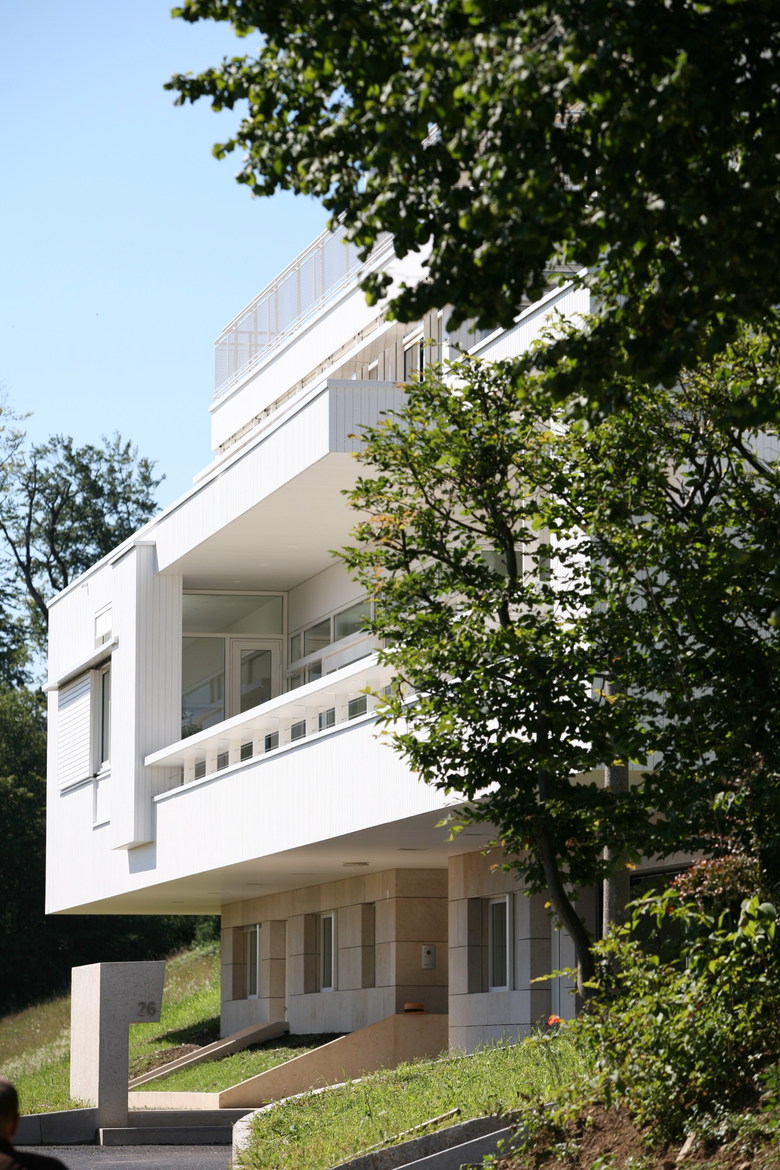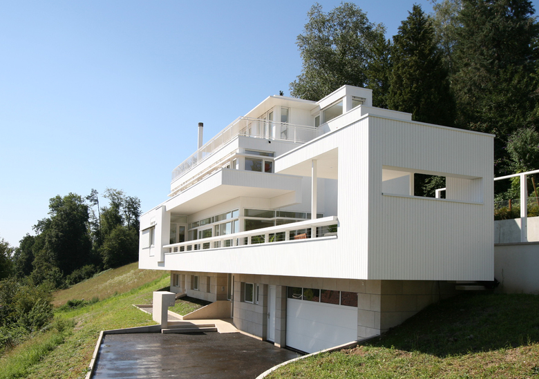 Am Ende des von dichtem Laub gesäumten Schachenweg, öffnet sich die weite, abfallende Wiese der Freihaltezone Hasenbühl. Der Blick schweift entlang des Hanges zum fernen Wald. Bergseitig erscheinen, ohne sich dem Betrachter in den Weg zu stellen, über einem Kalkstein-Sockel, leicht schwebend, die weissen Holzkuben des Hauses Trottenweg.