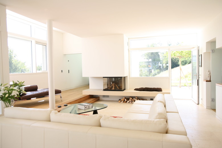 Zurückhaltender Innenausbau aus geöltem und weiss gestrichenem Holz, Kalkstein und Weissputz. Die präzise und funktionale Detaillierung ist zurückhalten und edel gehalten. Die künstliche Beleuchtung übernimmt die Lichtführung des Tages- und Nachtlichtes über Fenster und Oberlichter und wird so Teil der Raumkomposition.