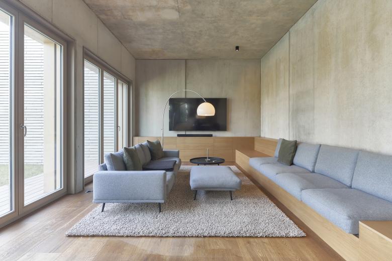 Im Inneren des Hauses harmonieren puristische Sichtbeton- und Holzoberflächen und lassen ruhige, teils offene, teils introvertierte Raumzusammenhänge entstehen, die auf die jeweiligen Nutzungsbedürfnisse reagieren.