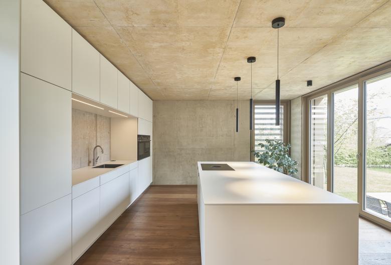Die aus lediglich zwei schlichten Blöcken bestehende offene Küche schließt sich fließend an den Wohn- und Essbereich an und orientiert sich ebenfalls zum Gartenhof.
