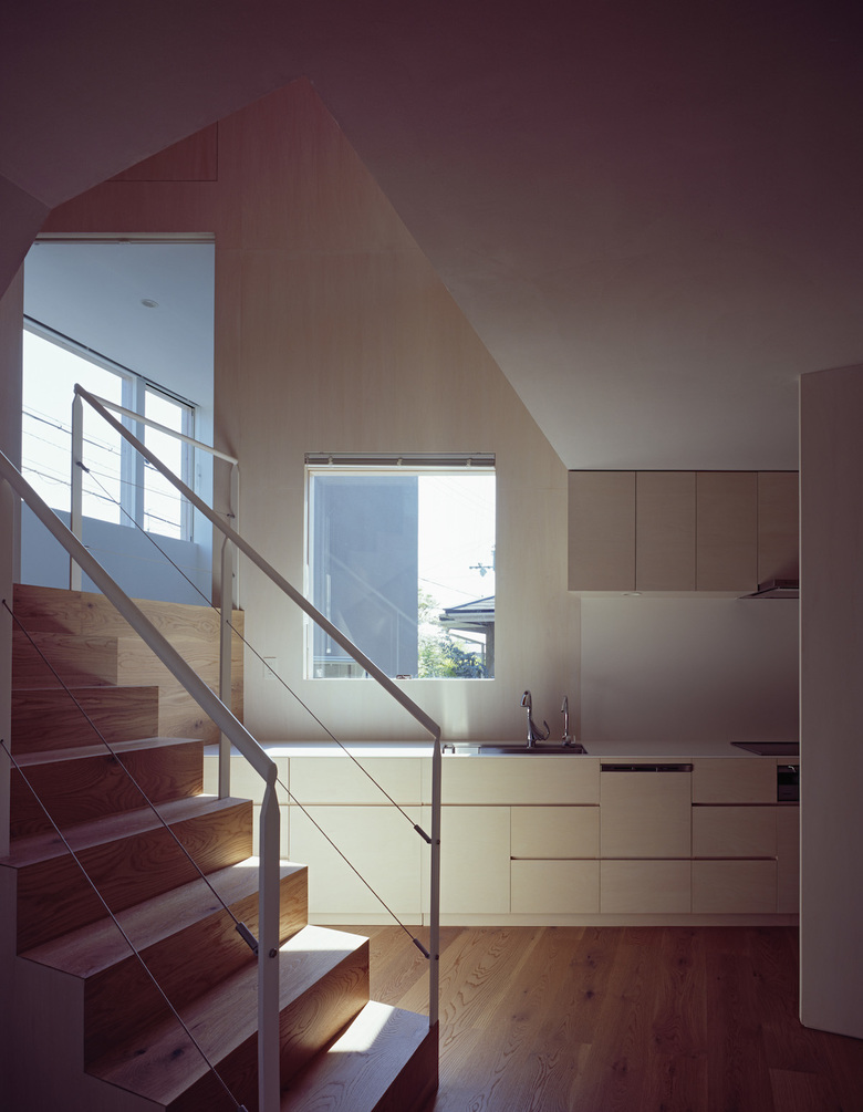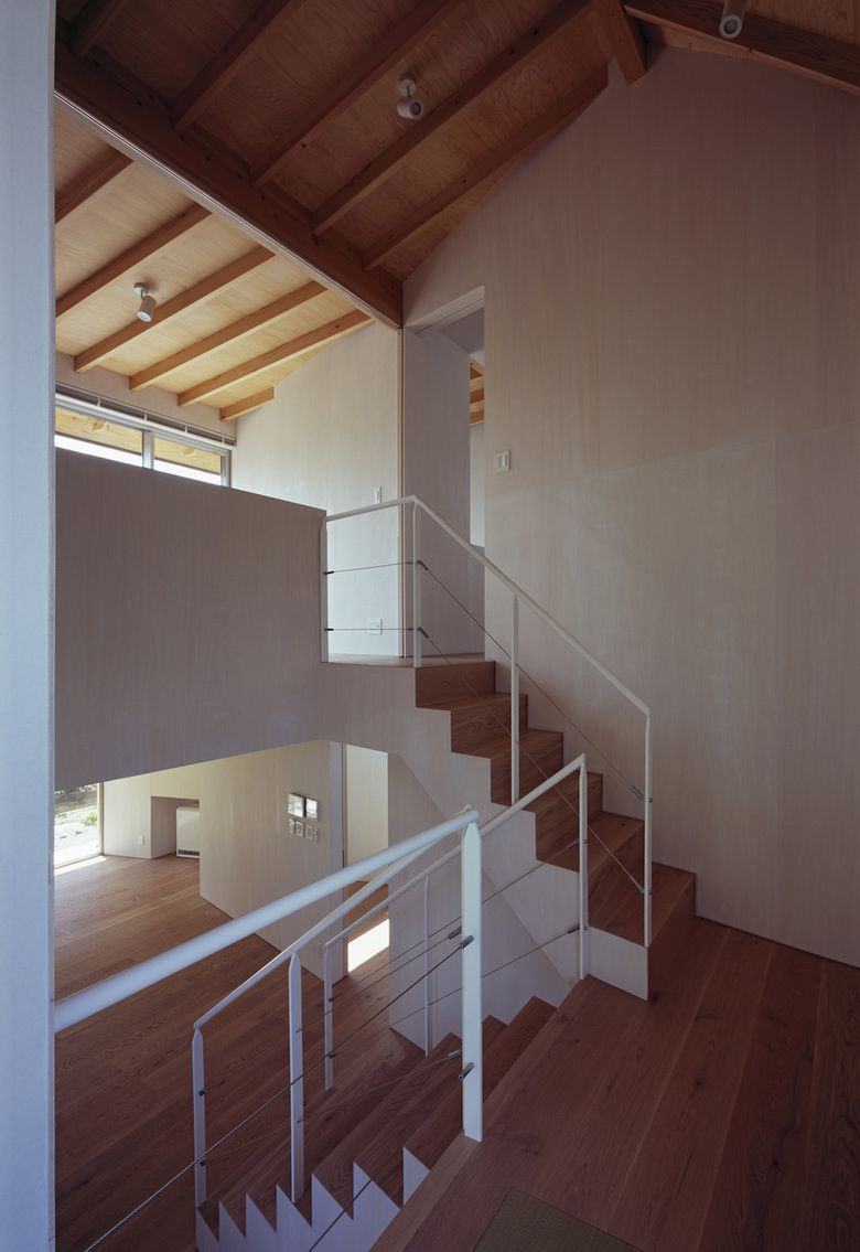 敷地は傾斜地であることから、地形に沿うように床はスキップフロアで構成されている。その為、階の分節が緩やかになり、断面的な空間の連続性が確保されることとなる。
