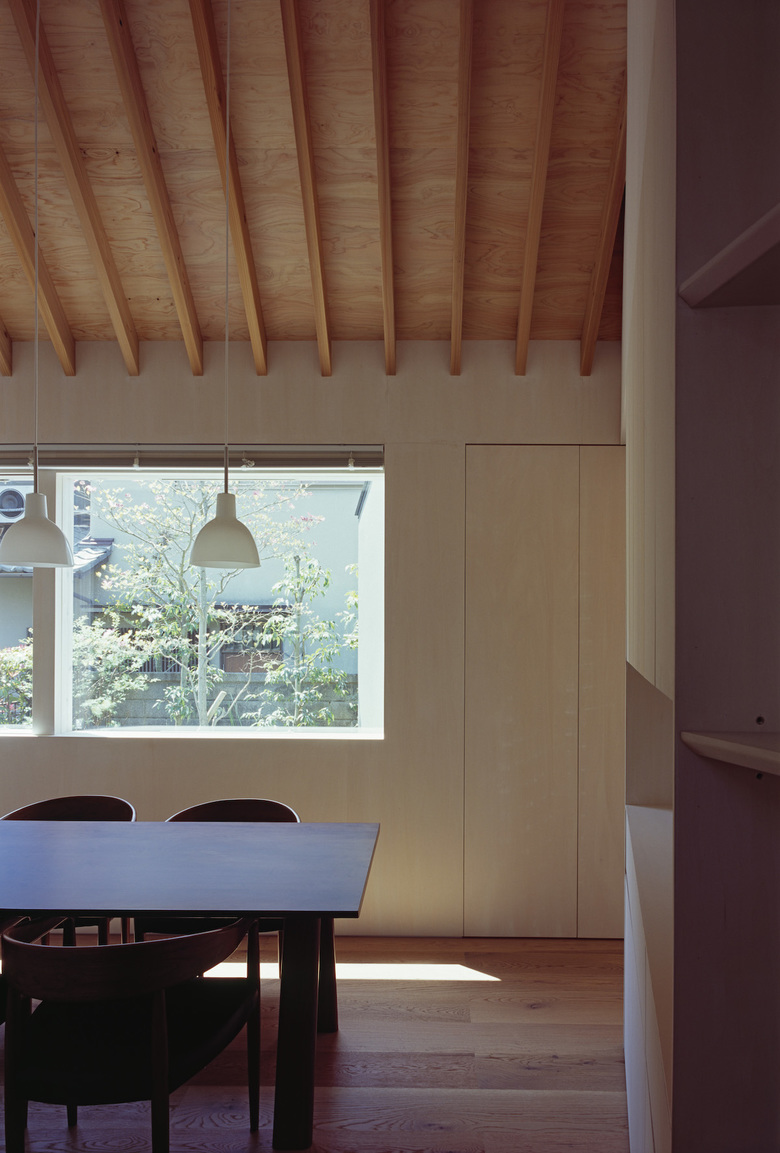 奈良の郊外に建つ住宅。子どもは既に独立し夫婦二人での生活となるとのことから、プライバシーを気にせず、開放的な設えとすることを強く望まれていた。一方で、大きなホールのような開放感は落ち着かないとのことから、空間としては連続性を保ちつつ壁や家具で緩やかに分節する方法を採用した。