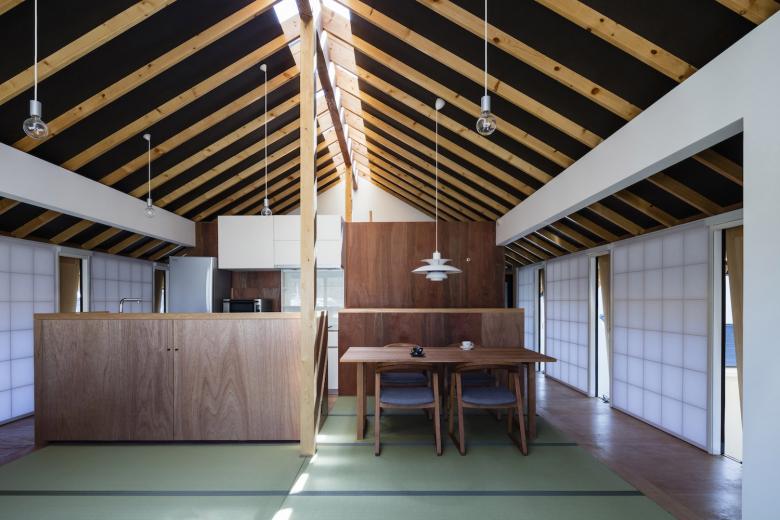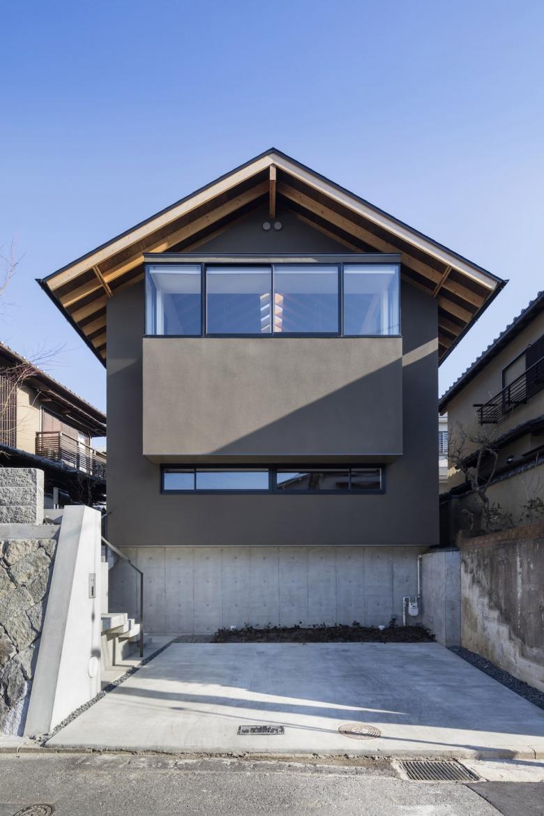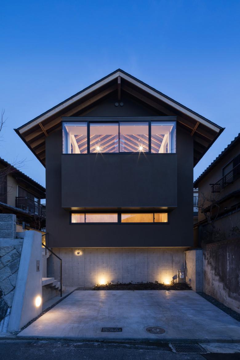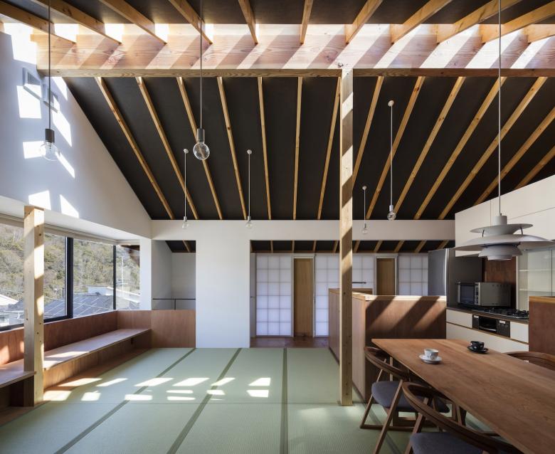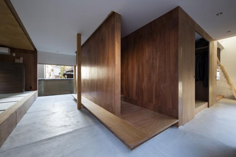 グラウンドレベルでは、それは土間空間として内部に取り込まれ、そこに囲まれるように居住スペースを確保している。上階ではそのバッファゾーンは縁側となり、視線を遮るように障子を設けながら採光を確保し、隣家との距離感を曖昧にしている。また数ヶ所、突出し板戸による通風口を設けてプライバシーを守りながら通風を可能にしている。