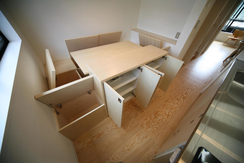 一方で、小さな個々の室に広がりを持たせるために、リビングの棚とキッチンカウンターは階段室に位置する冷蔵庫と収納を通して連続させるなどして、それぞれの室を連続させる工夫をしています。