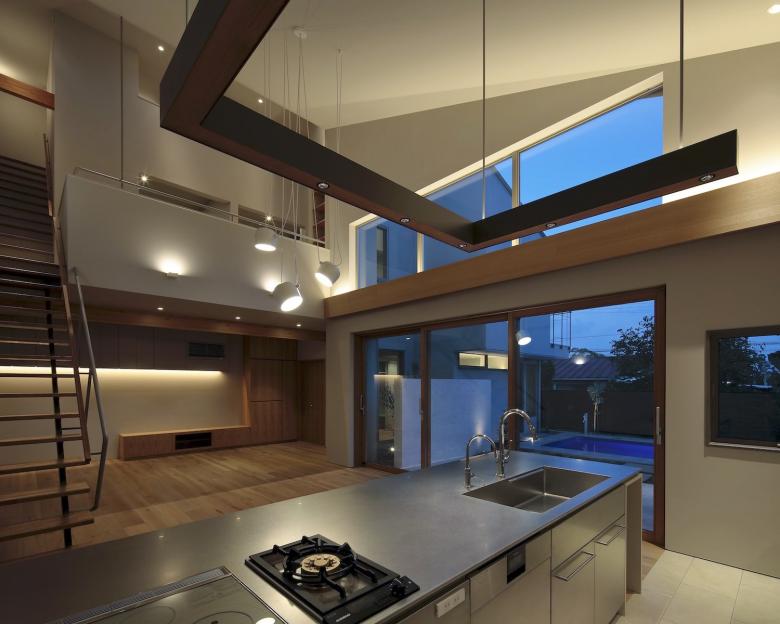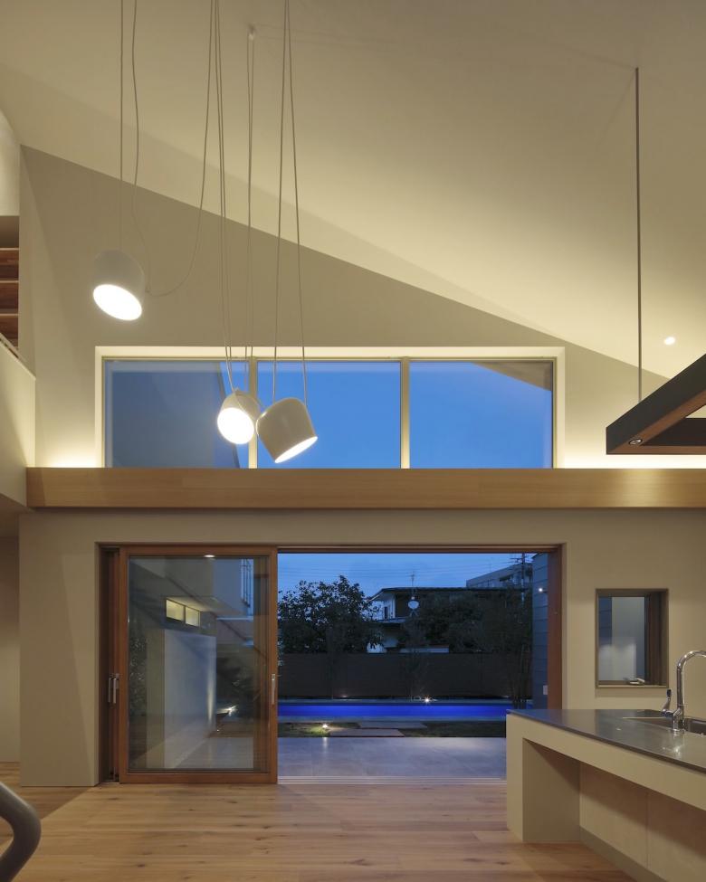 この計画は冬のリビングに陽があまり入らないことで暖房に頼る時間が長くなる事がデメリットだが、屋根の形状と広さから太陽光発電の効率が良く、冬のリビングダイニングは自然エネルギー利用の床暖房によって十分暖かい。ここ最近の猛暑と長い夏になりがちな気候を考えた時に、夏を過ごすための方法として陽を入れないリビングとプールの組み合わせはとても有効であるように思う。