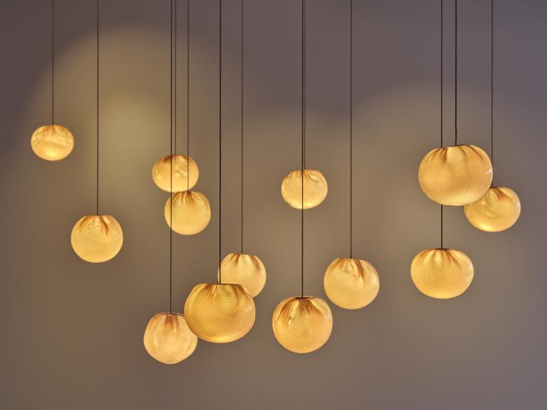 Given the brief that the space should remain flexible for different table positions and settings, we created an eye-catching lighting feature with mouth-blown globes. Each globe is unique and the copper mesh embedded in them, makes for a warm glow and textured look.