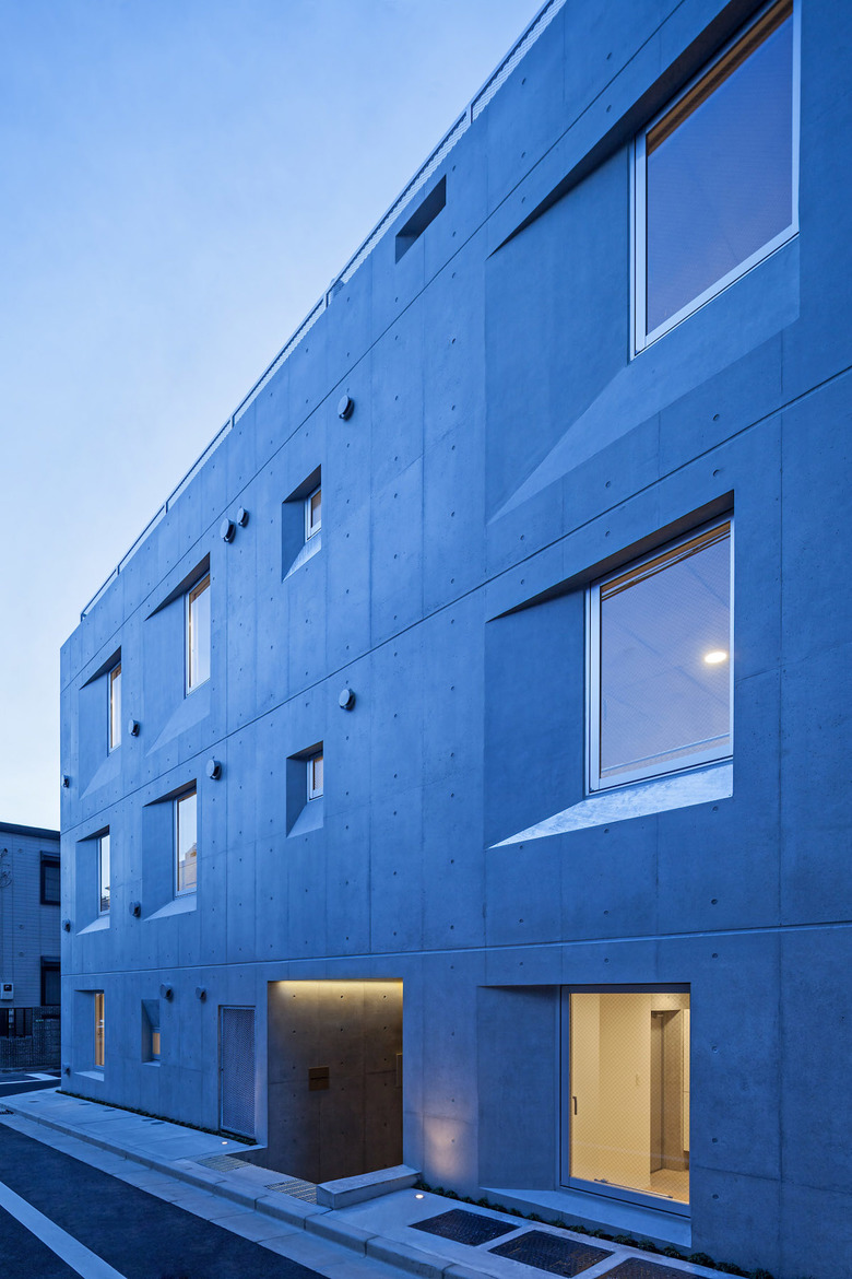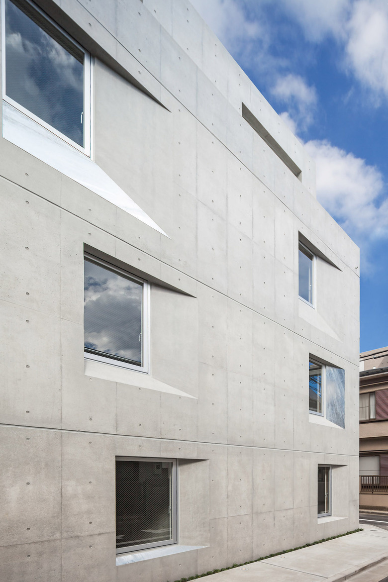 敷地周辺は細い道路を介して戸建て住宅が立ち並ぶため、近隣住民との視線交錯を避けるように開口を少しずつシフトさせた。この開口配列により光や風、風景を取り込みつつコンクリートという重たい素材に軽やかさを与えた。