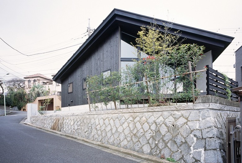 丘陵地にある郊外型住宅街の三差路に面して建つ平屋住宅。