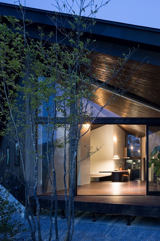 周囲への圧迫感を考慮し、軒高を抑えた切妻の大屋根を架けた佇まいとし、変形した敷地形状と高低差を生かすべく、大屋根の下に敷地に沿って部屋を配置した。残された歪な残余空間には敷地高低差にあわせて床高さを設定し、平面的にも断面的にも変化に富む、周辺環境に馴染んだ豊かな場をつくっている。