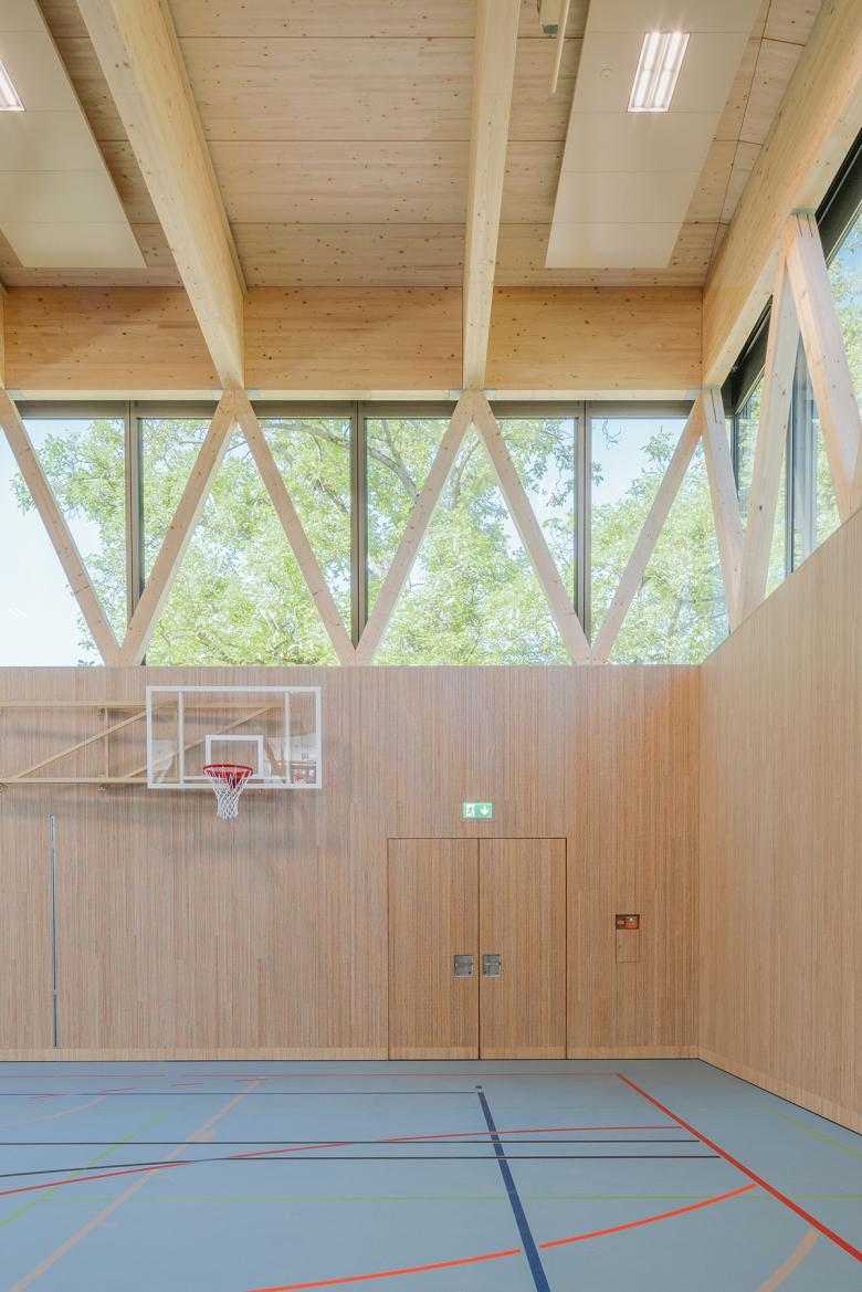 Der Baukörper wird am Rand des kleinen Tals positioniert. Der Landschaftsraum bleibt frei, die Topografie spürbar. Das Gebäude entwickelt sich aus dem Terrain und nimmt sich in der Höhe stark zurück. Dadurch wird die Sicht auf die Silhouette des Schloss- und Kirchenbezirks nicht beeinträchtigt. Das Projekt wird als Pilotprojekt mit der Arbeitsmethode BIM umgesetzt. Das gesamte Planerteam nutzt hierbei die optimierte, integrale Planung mittels eines digitalen Gebäudemodells. In einem zweiten Schritt wurden bis 2022 die denkmalgeschützten Gebäude der Schulanlage saniert.