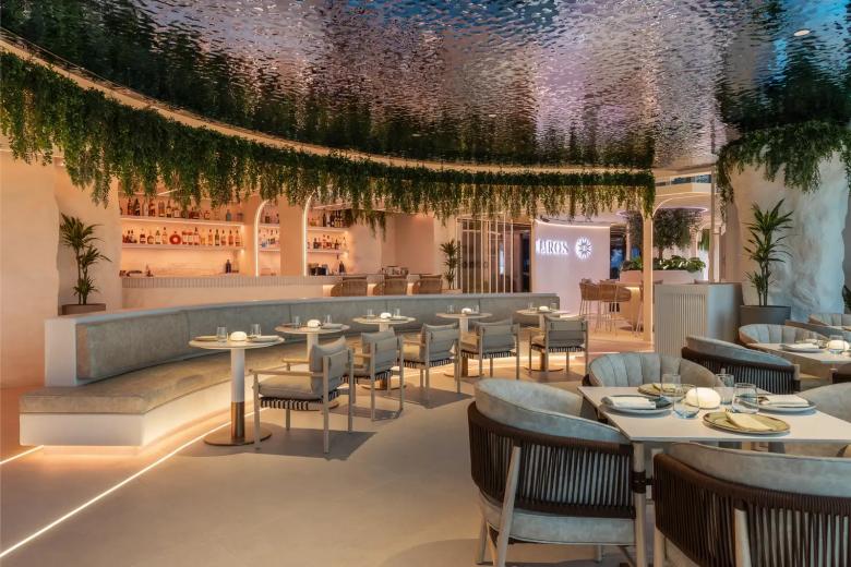 A sweeping curved canopy links the indoor restaurant with the open-air rooftop, creating a continuous architectural rhythm. It blurs the line between interior and exterior, guiding guests through dining, lounging, and poolside experiences. Inside, a rippled blue ceiling evokes the Aegean Sea — shimmering by day and glowing in turquoise hues at night — surrounded by lush greenery that reinforces the idea of an island in the sky.