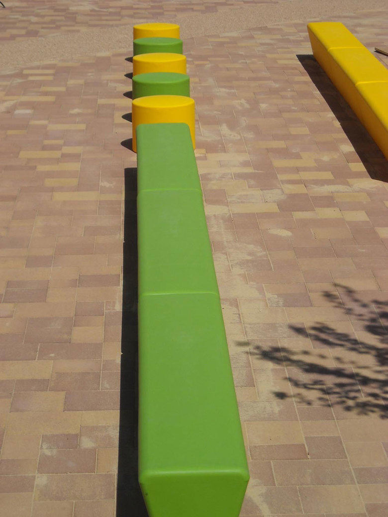 Aufenthaltsorte. Die Anordnung der Bänke und Sitzwürfel, parallel zum Schulgebäude und hintereinander in der geneigten Fläche, ermöglicht die Nutzung einerseits als Aufenthaltsbereich während der Pausen- und Hortzeiten sowie andererseits als `Tribüne´ oder Zuschauerraum für Schulveranstaltungen.