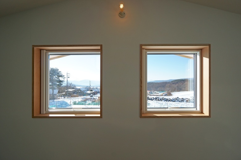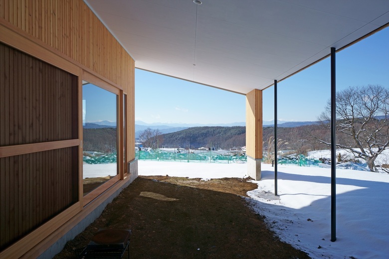 長野県茅野市に位置する、夫婦と子供のための住宅です。敷地は南北に長く、東側には八ヶ岳の山々、西側は茅野の市街地に向かって雄大な景色が広がっています。施主は植栽家・ランドスケープデザイナーであり、これまで建築家との協働もおこなってきました。この地が地元ではなく鎌倉からのIターンであり、自らの庭を作庭出来ることと、この景色に惹かれて移住を決意されました。今回の建物は『2』とあるように、2015年長野県松本市に我々が設計をおこなったペッタンコハウス1をカスタマイズしたものです。ペッタンコハウス1は工芸家である施主の人脈を活かして地元のカラマツ材で構造材、外壁材、床材、副資材を賄い、更に規格の長さの4mから建物高さや登り梁の接合箇所等が決定されているので『木取りを知るフォルム(つまりペッタンコ)』と呼ぶようになりました。今回の施主と共にペッタンコハウス1を訪れた際に、その汎用性の高さと快適な空間にたいへん感銘を受けて頂き、これをベースとすることにしました。その際、ペッタンコハウスのコンセプトを維持するために、5つの原則を設けました。詳細な変更は多々ありますが大きな変更点として、雨除けのある作業スペースとリビングからゴロゴロと転がれるピロティ空間を設えるために、南北にそれぞれ軒を2間伸ばすこととしました。また玄関が妻入から平入になった点、リビングの向きが南北で入れ替えられている点も内部空間の大きな変化です。